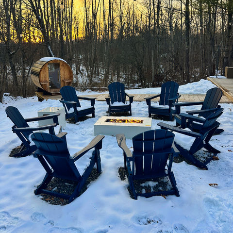 Outside is where Wanderwood settles into its rhythm. A cedar barrel sauna faces the forest through a large vista window, pulling the outdoors directly into the experience. It’s the kind of sauna you use daily, especially as the light shifts through the trees. Evenings slide naturally into the hot tub, steam rising through the woods before everyone drifts toward the fire pit. It’s a cycle that repeats itself easily, season after season.