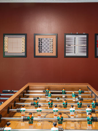The interior is open, social, and quietly confident. Living spaces flow easily into one another, anchored by a fireplace and elevated by designer finishes that feel curated rather than decorative. Bedrooms are arranged to give everyone space to reset, while shared areas invite lingering, whether that’s around the table, in the game room, or settling into the movie theater complete with a popcorn machine. A hand-painted mural adds personality without tipping into novelty, giving the house identity rather than generic polish.