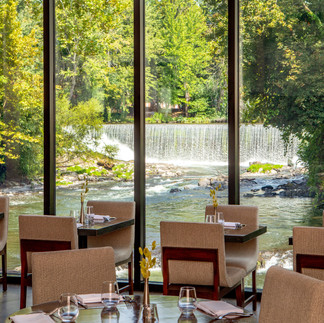 The Roundhouse sits right at the edge of the falls and still somehow feels like its own quiet world. Rooms are thoughtfully designed with artisanal furniture, soft light, and just enough industrial edge to keep things interesting, all framed by the sound and motion of the creek below. Floor to ceiling windows, historic brick, and a layout that flows from lounge to dining room to river views make the whole property feel like a cinematic snapshot of Beacon at its best.